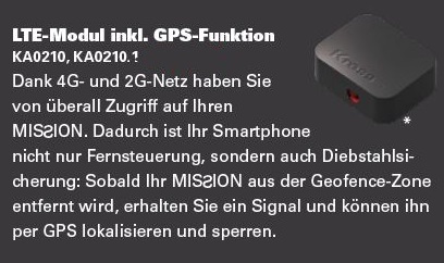 Dank 4G- und 2G-Netz haben Sie von überall Zugriff auf Ihren MISSION. Dadurch ist Ihr Smartphone nicht nur Fernsteuerung, sondern auch Diebstahlsicherung: Sobald Ihr MISION aus der Geofence-Zone entfernt wird, erhalten Sie ein Signal und können ihn per GPS lokalisieren und sperren.